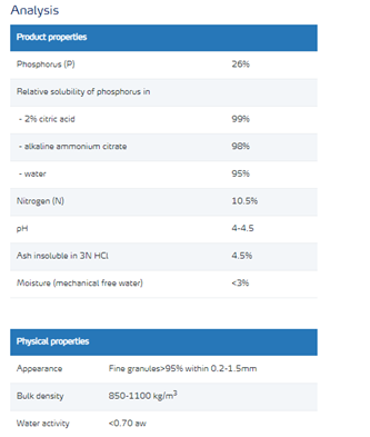 Una combinación purificada única de tipo alimenticio compuesta de fósforo y nitrógeno producida en condiciones precisas al reaccionar ácido fosfórico y una fuente de amoníaco en un granulador. La fuente de P de Yara es la apatita, de origen volcánico, lo que hace que el ácido fosfórico esté prácticamente libre de impurezas.