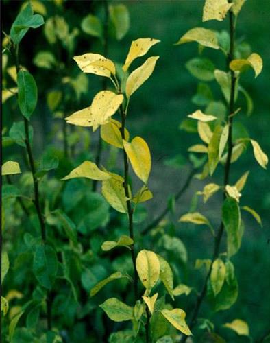 Con una deficiencia prolongada los nervios se vuelven también cloróticos y aparecen manchas necróticas en la zona clorótica de las hojas.