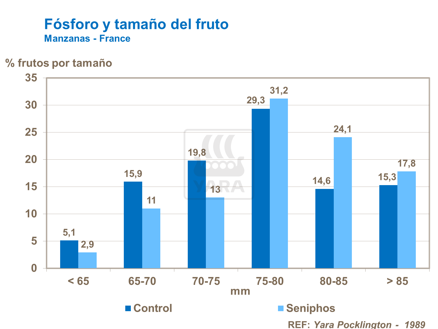 Diversos ensayos realizados en Francia muestran que el fósforo puede incrementar el tamaño 'premium': un 24% por encima de los 75mm. en manzanas.