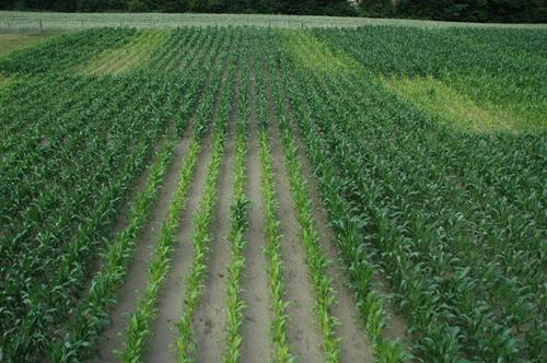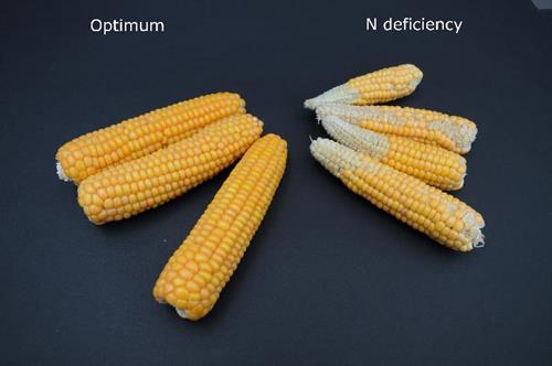 Deficiencia de nitrógeno en mazorcas (derecha).