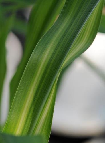 La hoja tiene apariencia listada con clorosis que van en paralelo a la nervadura empezando por la base de la hoja.