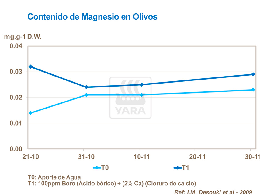 Para el mismo tratamiento como se describe más arriba, las concentraciones de Calcio y Magnesio en aceitunas fueron mantenidas durante la maduración del fruto y no se observó en las aceitunas ningún síntoma que pudiera afectar a la calidad del aceite. Las concentraciones de Calcio fueron significativamente mayores después de la segunda aplicación mientras que las concentraciones de magnesio permanecieron constantes durante todo el periodo.