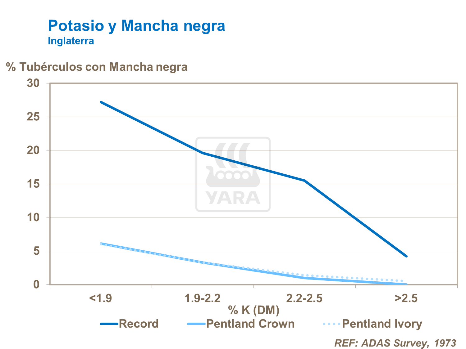 Este ensayo en Inglaterra muestra la relación entre el contenido de potasio y la incidencia de Mancha negra en diferentes variedades de patata.