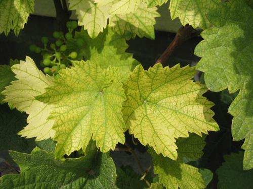 La deficiencia severa también produce síntomas en las hojas viejas. Los racimos enteros puede amarillear o coger un color verde amarillento.