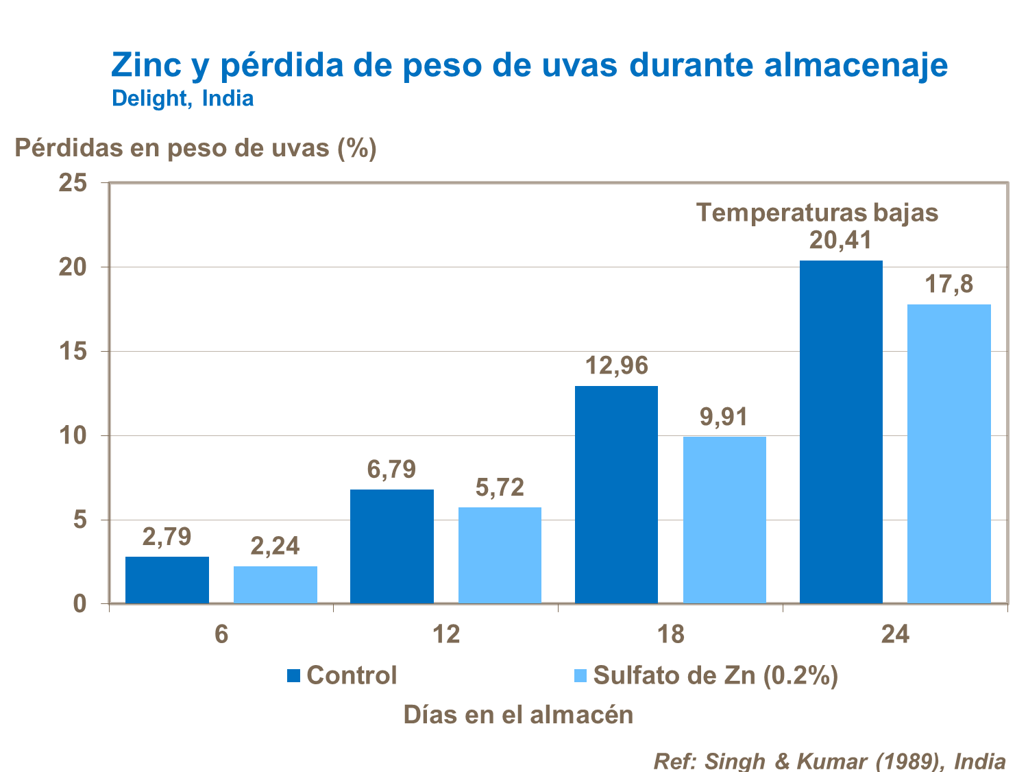 La deficiencia de zinc limita el desarrollo sano del cultivo. El Zinc tiene funciones esenciales en el proceso de multiplicación de las células. La aplicación de fertilizantes con zinc tienen un efecto positivo en el peso de la uva y la limitación de podredumbre en el almacén.