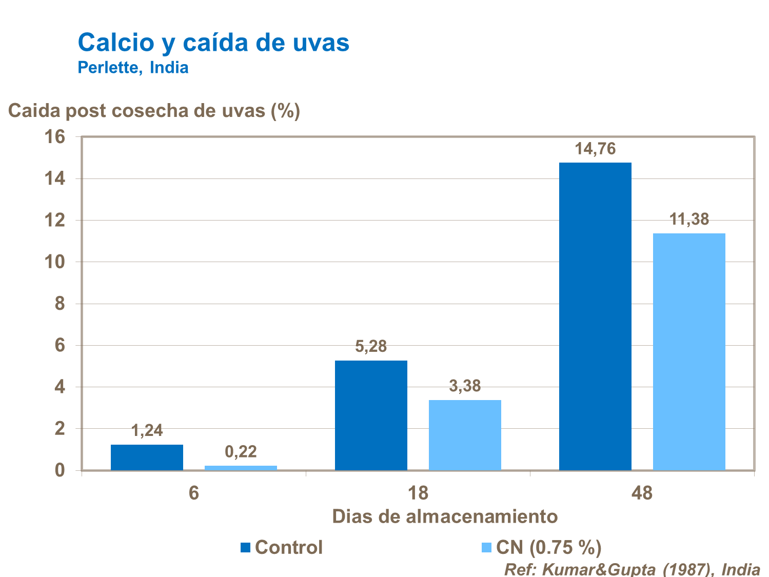 El calcio tiene una función esencial en el proceso de lignificación y maduración de la madera. Aumenta la tolerancia contra las heladas y enfermedades. Las aplicaciones de nitrato de calcio reducen la incidencia de podredumbre post cosecha y alarga su posibilidad de almacenaje.