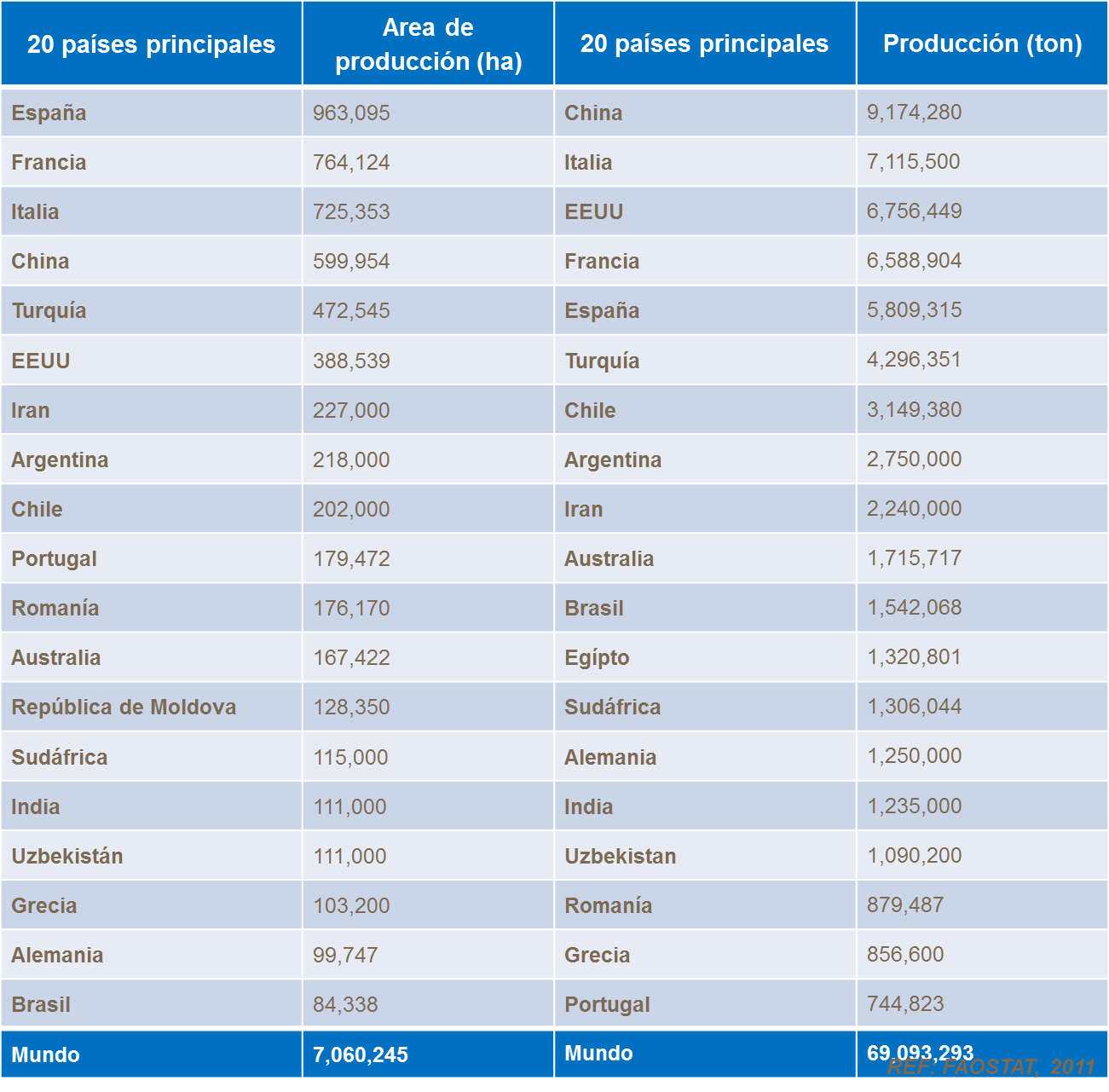 Los mayores productores de uva de mesa son China, Turquía e Italia. Estos tres, y otros países del hemisferio norte representan casi el 70 por 100 de la producción de uva de mesa. China consume casi la totalidad de los 3,8 millones de toneladas de uva de mesa que produce. Turquía e Italia son los exportadores principales hacia países europeos.